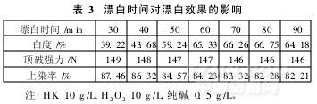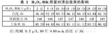 高的白度并合理利用漂白剂, H2O2/HK用量以10/10~15/15g/L比较适宜。