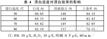 考虑到本试验采用低温漂白(80℃以下)工艺,因此,选定50,60,70,80℃四个温度点进行漂白,结果如表4所示。