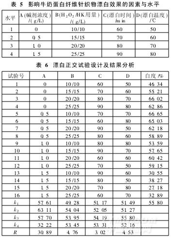 为了进一步分析漂白加工中各因素对漂白效果的综合影响,分别选取碱剂浓度、漂白温度、漂白时间和H2O2/HK用量进行L16(44)的正交试验。鉴于漂白后织物的顶破强力及染料上染率虽有不同程度的下降,但都能符合织物的服用性能,因此在正交试验过程中只把漂后白度作为衡量指标。其因素水平设计见表5,结果分析见表6。