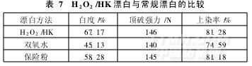 采用上述优化的H2O2/HK工艺对牛奶蛋白纤维针织物进行漂白,并与常规的双氧水漂白和保险粉漂白进行对比,结果如表7所示。