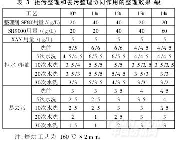 将拒污整理剂和去污整理剂共同作用于织物,并加入三防增进剂XAN以增加拒水拒油整理效果的耐久性。试验结果见表3。