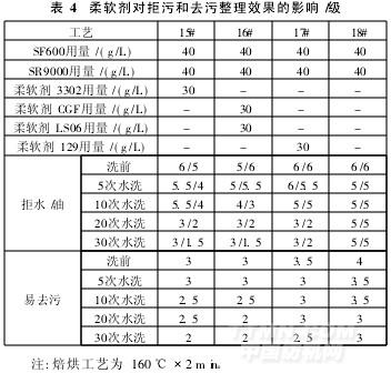 为了改善织物的撕破强力、耐磨性、外观及手感,拒污或易去污整理时常需加入一定量的柔软剂(用量一般为20~40g/L),但这会降低防水防油整理效果及其耐久性。