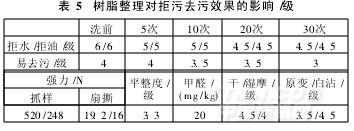 (4)棉织物同浴进行树脂整理和拒污去污整理,可增进拒污去污性能及耐久性,其易去污整理效果尤为明显。浸轧整理液时添加涂料,虽能改善色光,且对整理液稳定性没有影响,但会降低易去污性能。