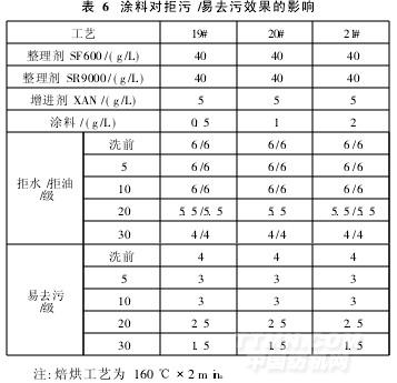 在拒污/易去污实际生产中,经常出现不符色现象,需要添加少量涂料进行修色。所选涂料必须是非离子型,且对拒污/易去污整理无影响。涂料对拒污拒油、易去污效果及其耐久性的影响见表6。