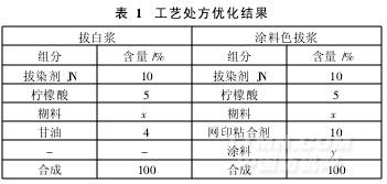 对不同的拔染剂、各种助剂的配比试验,比较其印花效果,获得优化配方,如表1所