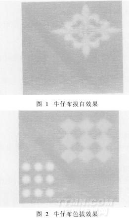 牛仔布拔染印花时,糊料和粘合剂的选择是拔染印花的关键。糊料的耐碱、耐酸、耐电解质性能必须良好,既能用于碱拔,又能用于酸拔,同时成浆后的流变性好,运行及储存稳定,印制的花型保形性好等。粘合剂对拔染剂JN和柠檬酸应有良好的相容性和稳定性,并具有柔软而高坚牢度的性能,以满足牛仔服进行预洗加工的要求。应选用低温型粘合剂,经蒸化可达到拔染和固着兼顾目的。印制时,色浆的粘度以控制在50~60dPa·s为宜。色浆太稠,不利于渗透;太稀则易渗化,且花型轮廓不清晰,产生毛边现象。