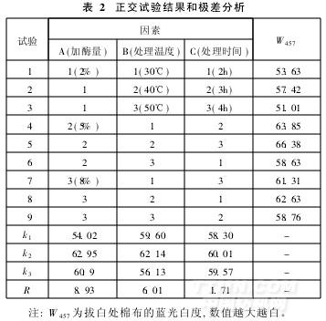 采用L9 (33)正交设计,进行了加酶量、处理温度和处理时间的3因素3水平正交试验,以确定最佳配比,从而得到最经济有效的处理工艺。其试验设计及分析结果见表2。