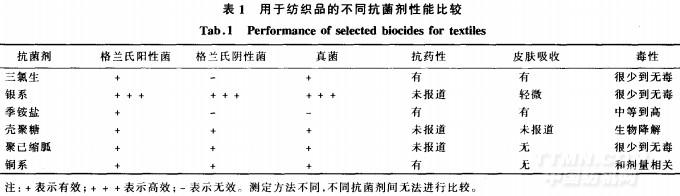 微量的、相对无毒的金属具有杀灭病原体和防止它们增殖的“微量作用效应”。在所有金属中,银最具微量生物活性。银的使用最早可以追溯到l8世纪使用硝酸银治疗胃溃疡[1 ]。l9世纪第1次确定了银离子的抗菌活性,到了20世纪20年代,胶体银由于可以有效地处理伤口而被美国食品药品署(FDA)认可[2-3]。与其他抗菌剂相比,银系抗菌剂具有抗菌性能高(见表1),不易产生抗药性的特点,具有很高的安全性。在温暖潮湿的环境里,银离子具有非常高的生物抗菌活性。同时,银系抗菌剂还具有很多优点,如对皮肤没有刺激性,不影响纺织品的服用性能,因此银系抗菌剂适合于抗菌功能纺织品的制备[4-5]