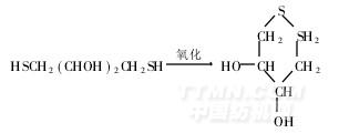 在使用带巯基的还原剂,即巯基乙酸(HSCH2COOH)、β-乙硫醇(HSCH2CH2OH)和1,4-二巯基丁二醇[HSCH2(CHOH)2CH2SH]作拆键剂的三种试验中,前两种属平衡反应,使用时必须过量,而这又使拉伸羊毛条随后的定形发生困难;而1,4-二巯基丁二醇经氧化后可形成稳定的六元环,见下式[1]: