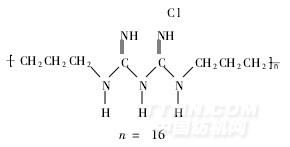 在高分子聚合物中直接引入抗菌基团而得的高分子类抗菌剂可以克服上述缺点,其性能稳定,不挥发,使用寿命长,易于储存,加工方便,不会渗入人或动物表皮。如BASF的Reputex(聚六亚甲基双胍)就是一种胍盐型的阳离子高分子类抗菌剂,其分子结构为: