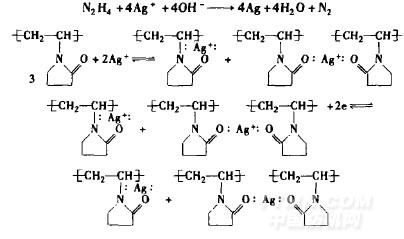 Z.Zhang[1]等用肼作为还原剂,PVP作为保护剂,制备钠米银。PVP提供的孤对电子还原银离子,并防止银被氧化,该反应在碱性条件下进行: