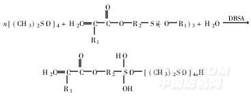 将一定量的催化剂十二烷基苯磺酸、非离子乳化剂A和去离子水,以及八甲基环四硅氧烷单体(D4)加入四口烧瓶中,高速搅拌乳化0.5h,并加热至一定温度,在N2保护下恒温反应一段时间,滴加硅烷偶联剂,即得带乙烯基的有机硅种子微乳液。反应式如下: