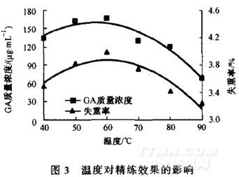 由于酶的催化作用与温度有着密切的关系,本文对40~90℃之间的精练效果进行了考察,其结果如图3所示。