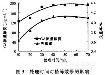 不同酶精练时间的试验结果如图5所示。由图可知,处理时间达到40min以后,织物的精练效果不再有明显的提高。一方面,果胶酶在水溶液中渗透表皮,透过缝或微孔与基质中的果胶接触,果胶物质借助于酶而裂解,随着时间的增加,果胶物质裂解增多,酶解产物中的GA质量浓度和织物失重率也同步增加;另一方面,随着处理时间的延长,热丧失活力的酶分子在总酶量中的比例逐渐增大,并