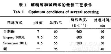 按上述试验方法及步骤用诺维信2种商品酶在棉针织物上作最佳工艺条件试验。根椐试验得出精练酶Scourzyme301L以及碱性果胶酶Bioprep3000L处理18.2tex纯棉针织物的最佳工艺条件,其结果如表1所示