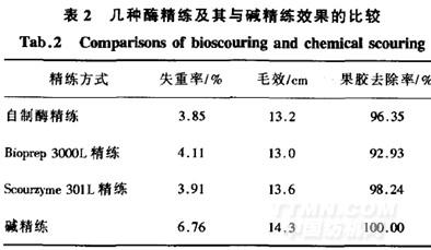 好于诺维信的2种产品。从用量上来看,由于商品酶Scourzyme301L是复配酶制剂,精练时存在着多种酶的协同作用,所以果胶酶的用量较少(精练浴体系中维持200U/L的碱性果胶酶)。而自制酶的用量
