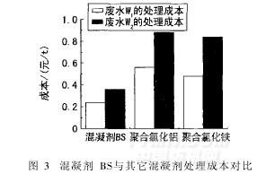 由表4和图3可见,采用工业固体废物制成的混凝剂BS用于印染废水处理时,在达到较好处理效果的同时,能够大大降低水处理的药剂消耗费用,减少废水处理成本,这对废水排量大的印染厂具有重要的现实意义。