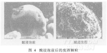由图4可见,废渣经过酸浸泡后,其颗粒外表有许多不规则的凸起和孔洞,表面或微孔内变得更加粗糙,比表面积显著增大,这相当于表面被活化。活化后的废渣对有机物和染料有很好的吸附能力。