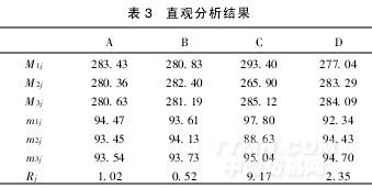 利用数理统计知识对表2中数据进行直观分析,设Mij表示第j列中水平数为i的各实验数据之和, mij= Mij/3,Rj表示极差。直观分析结果见表3。