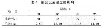 由表4可以看出,缩合反应温度为90℃时所合成的试剂渗透性和毛效均较好,故选择缩合反应温度为90℃。