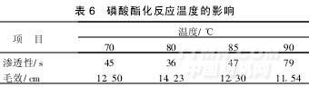 由表6可以看出,磷酸酯化反应温度为80℃时所合成的试剂渗透性和毛效均较好,故选择磷酸酯化反应温度为80℃。