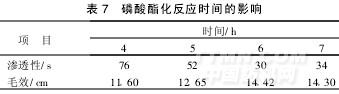 由表7可以看出,磷酸酯化反应时间为6 h,所合成的试剂渗透性和毛效均较好,故选择磷酸酯化反应时间为6 h。