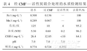 将活性炭作为CMF处理出水的后续处理,实验结果如表4,分析表明,用CMF—活性炭工艺处理后,Fe、Mn金属离子的去除率达到100%,色度为4度、浊度0.2NTU、pH7.0、COD<10mg/L,各项指标均达到印染用水水质要求。与单独用CMF处理效果相比,铁的去除效果大大提高,且色度和浊度去除率都有不同程度的提高,由此可见,在经过CMF预处理后,Fe等金属离子浓度的降低更有利于活性炭的吸附,实验结果表明,作为后续处理单元的活性炭对Fe、Mn金属离子以及Ca、Mg的去除率大大提高。对比活性炭—CMF和CMF—活性炭两种处