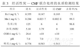 为进一步提高Fe、Mn等金属离子和色度的去除率,将活性炭与CMF装置联用,处理实验结果如表3所列,结果表明,活性炭和CMF联用处理后,Mn、色度、浊度、COD、pH均能达到用水要求,浊度去除为100%,色度去除率为96.8%,锰为99.3%,但铁的去除率仅为71%,质量浓度为0.103mg/L,不能达到工艺用水要求。与单独用活性炭的处理结果相比,浊度、色度、Mn的去除率都提高,但Fe的去除率变化不大,由此可见,CMF对经过活性炭处理后的较低浓度的Fe离子去除效果也不佳。