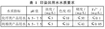 印染废水的处理与回用研究,应与印染生产实际情况相结合。该企业确立了“分质供水、清污分流”的清洁生产方针,实施染整生产全过程清洁生产。生产废水清污分流排放,降低了废水的处理难度;以分质供水方式,将回用水分类回用于不同生产工序,降低了处理成本。该企业生产最大用水量为30000吨/日,规划回用水量为20000吨/日。二级处理后,出水与自来水源水(河水)混合,进入深度处理。其中,深度处理软化后,出水直接供应化纤类产品生产用水;深度处理反渗透(RO)膜处理后,出水回用于纯棉类产品生产。深度处理软化前部分工程已建成,并投入运行;RO处理工艺已完成中试。公司化纤类和纯棉类产品染色工艺对回用水水质要求见表1。