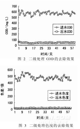 将印染生产的工业废水分类排入污水处理厂。其中,轻污染废水直接排入,重污染废水回收部分可利用物料,再经物化初步处理后排入。污水二级处理工艺采用(厌氧)水解酸化→好氧生物接触氧化→投药气浮处理工艺,其处理流程见图1。二级处理工艺对COD和色度的去除效果见图2和图3。