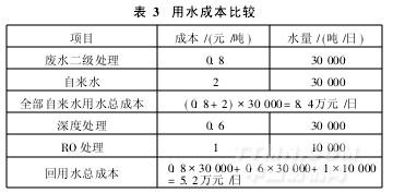 该公司2007年生产总用水量30000吨/日,废水回用工程全部建成后回用水量20000吨/日,深度处理水总处理量30000吨/日(含水源水10000吨/日)。软化处理后直接回用20000吨/日,RO处理后回用水10000吨/日,废水实际回用率为66.7%。回用工程总投资约1500万元。采用回用水与直接采用自来水的用水成本比较见表3。