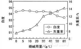 改性茶皂素用量40g/L,在改性茶皂素处理液中加入适量烧碱,按1.2.1节工艺于98℃对棉织物浸渍处理40min,考察烧碱用量对织物白度和失重率的影响,结果见图5。
