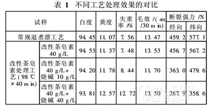 比较改性茶皂素工艺与常规工艺处理试样的各项性能,结果见表1。