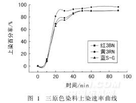 为了解活性染料三原色红3BN,黄3RN和蓝S-G对真丝/棉交织物的染色性能,对其上染率进行分析,见图1。