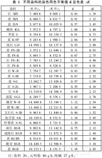 为使真丝/棉双组分面料获得良好的同色性,首先要选择合适的活性染料。本试验分别选用不同厂家的活性染料对真丝/棉交织物进行染色,通过分析其表观深度K/S值与色差ΔE,筛选出同浴染色同色性较好的三原色染料。