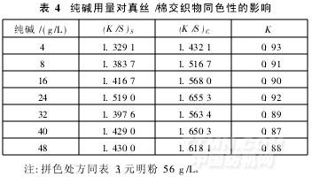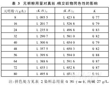 由表3可知,随着元明粉用量增加,真丝与棉织物的染色深度都有所提高,且同色性也提高;当元明粉用量增加至56g/L后,同色平衡值K变化不大。综合考虑,元明粉用量以56g/L为宜。