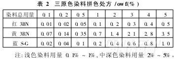 由图2可知,采用优化工艺染色,不同浓度的三原色染料拼混对真丝/棉交织物都有很好的同色性及提升力,表明该工艺适合真丝/棉交织物同浴染色.