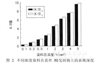 经试验筛选,真丝/棉交织物采用三原色活性染料红3BN,黄3RN和蓝S-G染色,同色性较好。其优化的工艺为:浅色元明粉56g/L,纯碱8g/L;中深色元明粉80g/L,纯碱24g/L;染色温度60℃,保温时间60min。