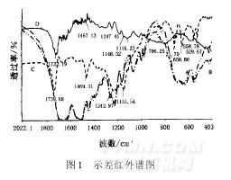 对经O2等离子处理后用TG-410整理剂整理的丝织物ATR红外谱图(A)与未处理织物红外谱图(B)作示差,得到的谱图(D)跟整理剂TG-410的图谱(C)作比较。测得的红外谱图如图1所示,整理剂TG-410为氟化乙丙烯聚合物,整理剂TG-410的红外谱(C)中在波数1739·68cm-1出现了-C=0的特征吸收峰,而示差谱(D)在波数为1722·1cm-1处的峰,也存在一个较为明显的峰,但未处理织物(B)在附近处不出现此峰。示差谱(D)在1722·1cm-1处的峰,可能就是-C=0的伸缩振动吸收峰,是由于整理剂中的共扼双键断裂接于织物后从而使-C=0吸收峰向低波数发生了移动。因此织物经拒水拒油整理后织物表面-C=0的引入说明整理剂TG-410已经接枝到织物的表面。