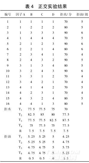 由表4比较得出拒水拒油整理最佳条件: