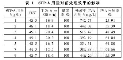 由表1可知,STP-A用量在1~4g/L,织物白度、毛效及PVA分解率均不断提高;当STP-A用量大于4g/L后,织物上PVA分解率,白度和毛效有变差趋势。因此,后续试验取STP-A用量为4g/L。