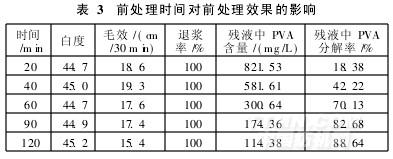 由表3可知,延长前处理时间,织物白度略有增加,PVA浆料的分解率随前处理时间延长而升高,当前处理时间达120min时,其分解率达到最大。考虑处理效率和成本,确定前处理时间为90min。