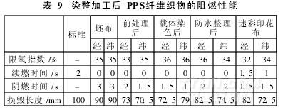 染整大生产加工后PPS纤维织物的阻燃性和限氧指数见表9。
