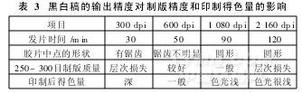 四分色印花黑白稿的输出精度将直接影响后道制版精度和印制的得色量。比较输出精度300dpi、600dpi、1080dpi、2160dpi等工艺试验,得出表3的数据(以80mm×130mm胶片为例)。
