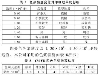四分色印花对色浆黏度有特殊的要求,网点之间要尽可能避免相互渗化,以保证色光的鲜艳度。通过大量试验发现,要避免渗化现象,色浆黏度必须比传统丝绸印花稍高一些。表7是色浆黏度变化对印制效果的影响。