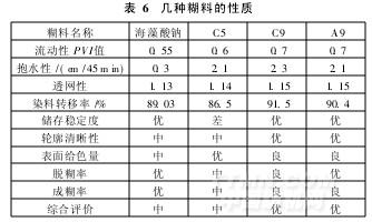 丝绸印花糊料应用已经成熟,大生产中所用的几种糊料都具有较好的鲜艳度、流变性、触变性、抱水性、曳丝性、储存稳定性、渗透性、轮廓清晰度和脱糊率等,如表6所示。