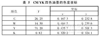 丝绸四分色印花技术是从四分色印刷技术得以启发而开发的,CMYK四色的色度坐标无疑要以印刷的四色为基础,并结合染料特点加以调配。表5列出CMYK四色油墨的色度坐标。