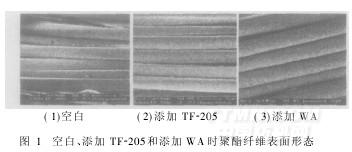 分别将低聚物去除剂WA和TF-2205与匀染剂同浴使用,同时做空白试验(染浴中不加低聚物去除剂)。染色后用扫描电镜观察纤维表面低聚物分布情况,结果如图1所示: