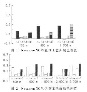 (2)图2为轧烘蒸染色工艺连续运转中色相的变化,显示在500、1000、1500、2000、2700m与10m作为标准色相的对比:ΔL、Δa、Δb、ΔE均小于0.5,也说明头尾无反差。