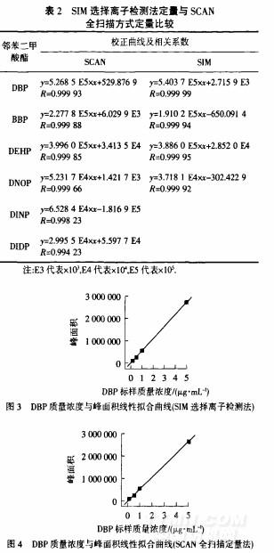 从图3和图4可以看出,经过多级校正得到的标准曲线呈很好的线性关系,保证了在相应线性范围内进行定量分析时数据的准确性.同时,经过sIM选择离子检测法定量与SCAN全扫描方式定量的比较,可以确证用SIM选择离子检测法定量得到的相应信号峰面积更大,线性相关系数更好.为此建议:在日常检测中,用SIM选择离子检测法来对邻苯二甲酸酯进行定量分析.